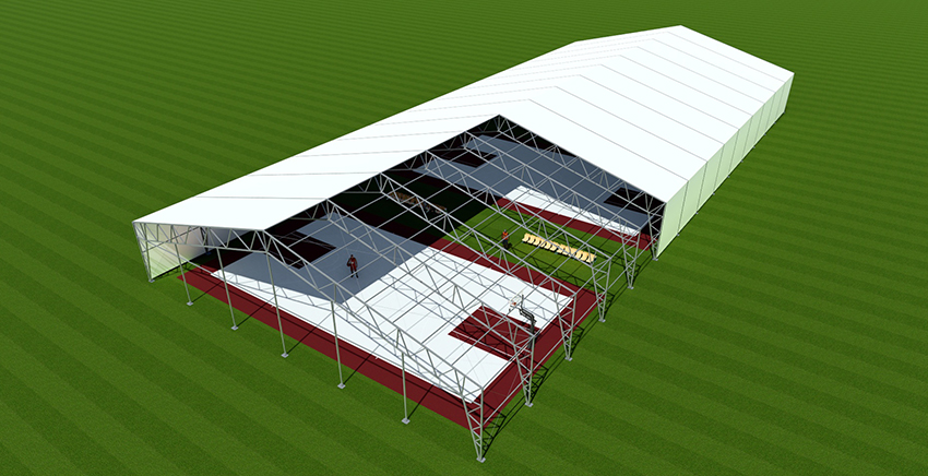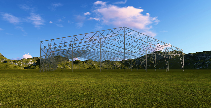 鋼框架篷房的主體結(jié)構(gòu)采用高強(qiáng)度鋼管材料,屋面采用鋼纜斜拉條加固,屋面及墻面均有基布圍護(hù)。鋼框架篷房工所用材料及結(jié)構(gòu)具備很高的完整性與安全性。