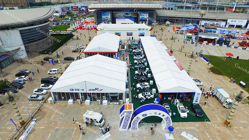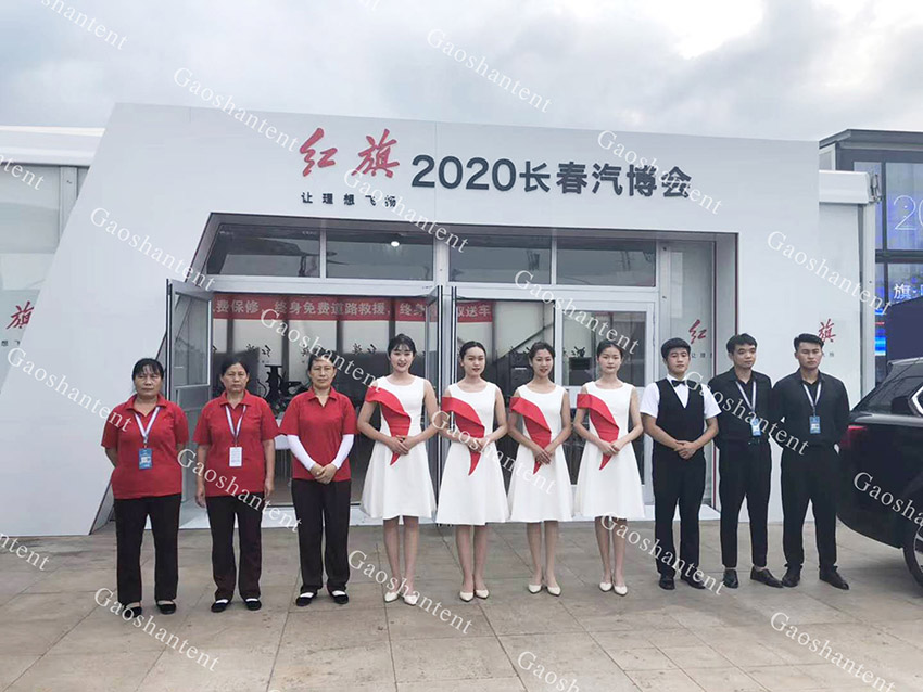 在本次汽博會中,高山篷房提供了超過20000平方米的展會篷房,包括了新車展示區、簽到區、洽談區、休息區、等候區、餐廳服務區等多個區域的臨時建筑。通過使用各式形態的裝配式鋁合金帳篷,及時地解決了長春汽博會場館緊缺的問題。此次特提供了大跨度人字形帳篷、弧形帳篷作為新車展示區的主場館。