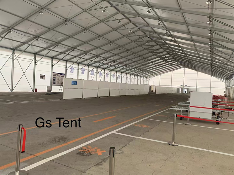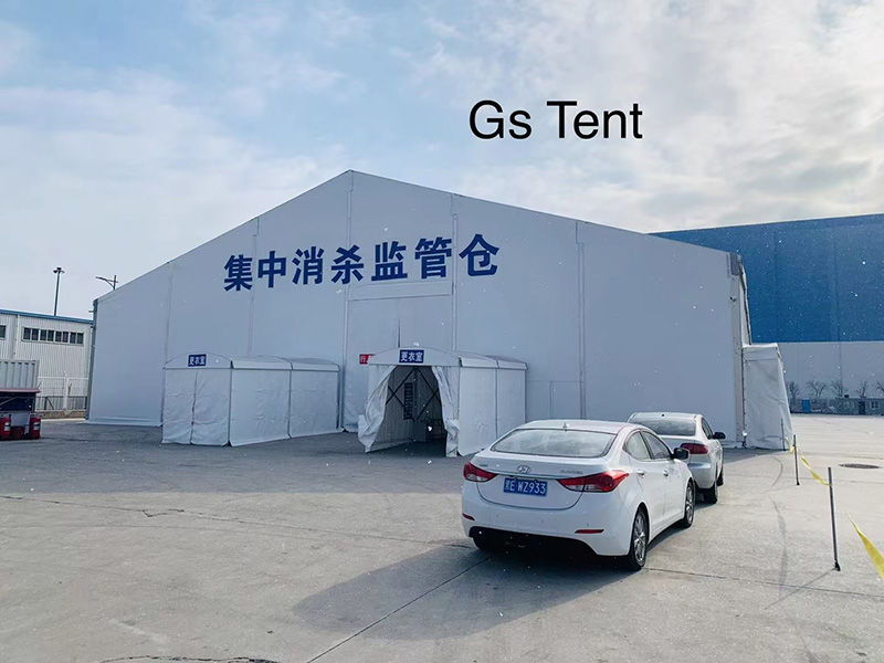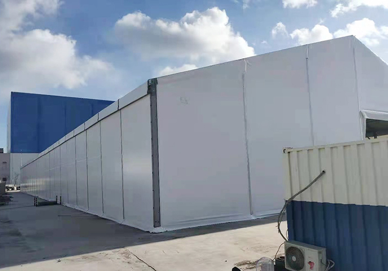 在本次大連冷鏈疫情中,高山篷房提供的2400平的裝配式物流倉儲篷房、22座推拉篷房和6座更衣室篷房已正式投入使用。在抗擊疫情這種緊急時刻,去臨時修建傳統(tǒng)固定倉庫,時間上是不允許的,因此搭建快速、結構安全的裝配式篷房就派上了用場。
