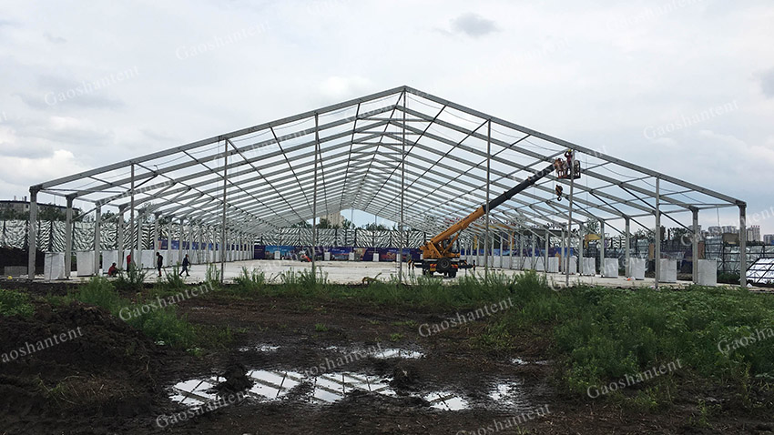 4,空間跨度大:篷房跨度可達(dá)70米,長(zhǎng)度不受限制,內(nèi)部無(wú)任何梁柱支撐,高度也可定制,即便是大型機(jī)械或設(shè)備都可以自由進(jìn)出,有效提升工作效率。