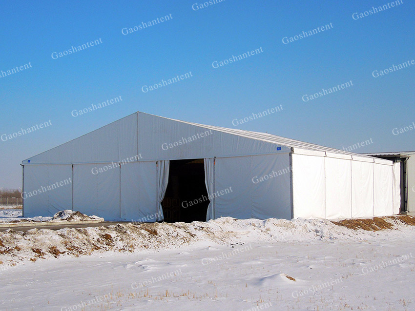 3,防風(fēng)防雪:對(duì)于工礦類企業(yè)來(lái)說(shuō),篷房使用期限較長(zhǎng),基本都要跨越四季,像山西、內(nèi)蒙等地區(qū)的冬季,常會(huì)出現(xiàn)大風(fēng)、寒潮、暴雪等極端天氣。而篷房可對(duì)風(fēng)雪寒潮進(jìn)行特別加固,采用的加強(qiáng)鋁材和篷布,可抗風(fēng)10級(jí),抗50cm厚的雪載,B1級(jí)防火,能夠很好地抵御極端天氣的考驗(yàn)。